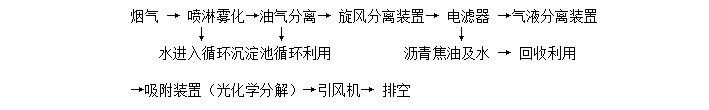 在引風機的負壓作用下帶有粉塵物質(zhì)的瀝青煙氣經(jīng)過加裝噴淋頭的管道,經(jīng)過連續(xù)噴漆淋使煙氣中的油粒子和小粉塵等被沖洗下來、混溶于水中后流入冷卻循環(huán)水池,出來的煙氣經(jīng)油氣分離裝置去除部分油質(zhì)及水分后進入旋風除塵除去部分不溶于水的焦粉等粉顆粒類物質(zhì),而后進入瀝青煙電濾器捕集掉剩余的油污及膠粉顆粒,處理后的氣體再經(jīng)過氣液分離裝置再次精細凈化,然后再進入吸附裝置或光化學(xué)分解裝置,除掉煙氣中的瀝青異味,凈化后煙氣通過煙囪排入大氣。